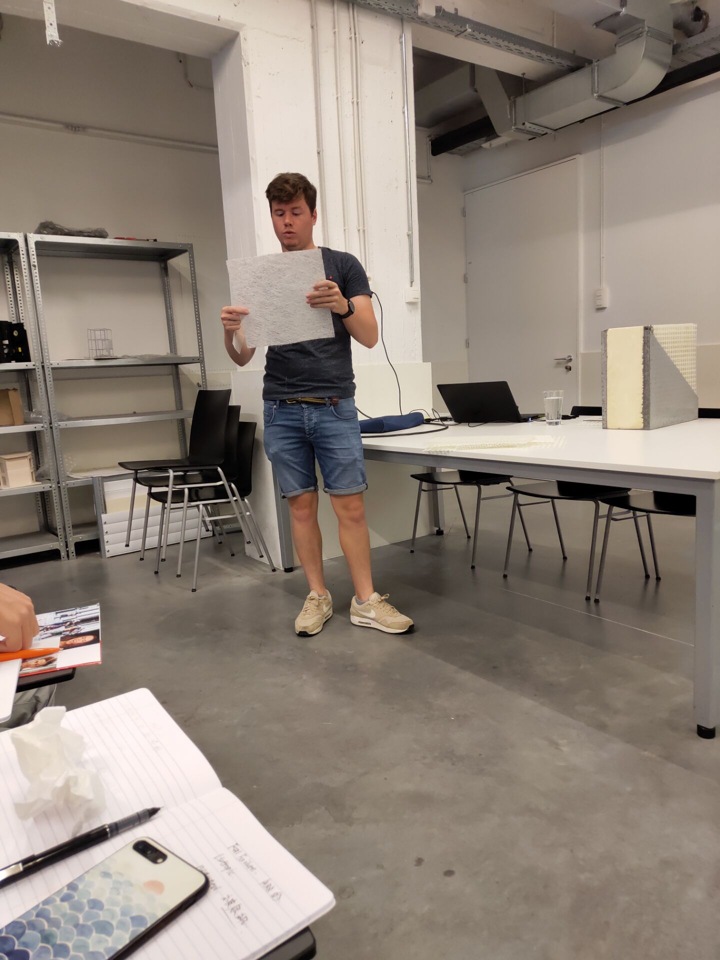 到达了VUB的教室之后,我们看到了今天的主讲人--De Munck硕士,他拿着一块三明治结构的实物进入了教室。由于在前一天的学习中,我们已经了解到了关于这个实验室的主要研究内容,以及三明治结构从设计之初考虑到的原理。所以在这堂课上,De Munck硕士给我们了讲述了一些关于三明治结构的实际应用方面的相关内容。介绍的重点是三明治的“面包”部分,也就是最外层的材料,它们是整个三明治结构的强度的主要来源。它们主要分为两个部分,一部分是经过特殊的几何形态排布成的玻璃纤维增强织物,另一部分是由传统的水泥等胶结材在玻璃纤维织物之间填充而得。接着,De Munck硕士讲述了他所在的团队在研发关于此种材料过程中所做的的种种实验,以及这种材料目前的应用。面对这种新型材料,访学团的所有同学都非常有兴趣,在课间休息的时间,也都纷纷凑上去近距离观察,共同讨论这种材料。