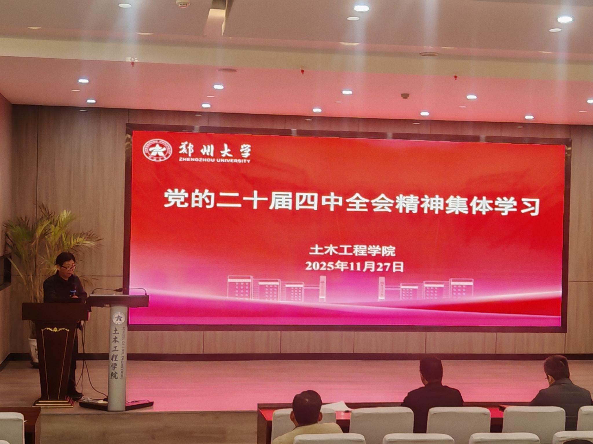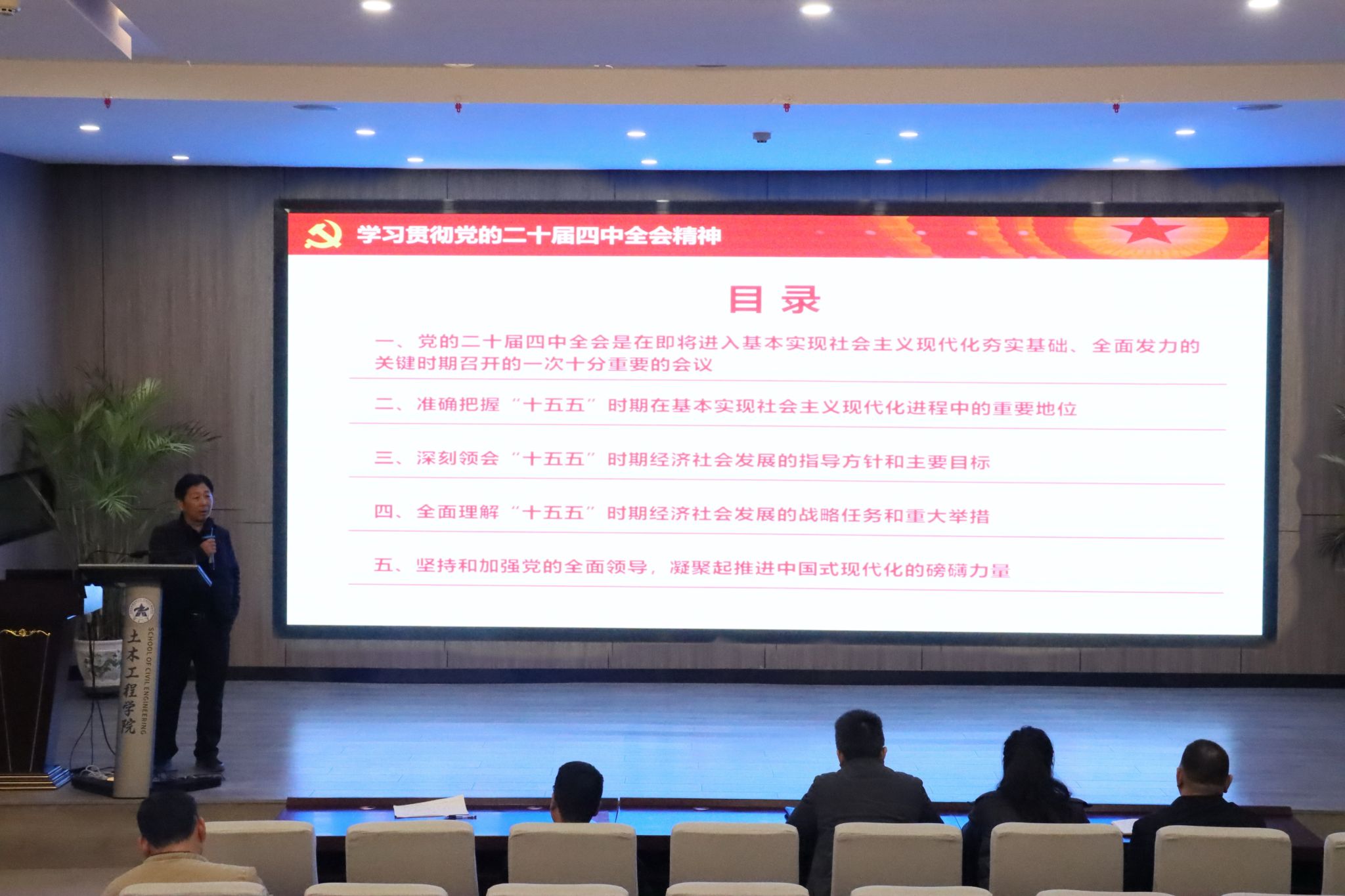一是要深刻认识党的二十届四中全会的重大意义。此次会议为关键时期的发展指明了方向、规划了蓝图,是凝聚力量、引领未来的行动指南。二是要准确把握十五五时期在基本实现社会主义现代化进程中的重要地位。十五五时期是承前启后、攻坚克难的关键阶段,必须深刻理解其历史方位和时代使命。三是要深刻领会十五五时期经济社会发展的指导方针和主要目标。要全面把握发展的指导思想、基本原则以及未来五年经济社会发展的宏伟蓝图和具体指标。四是要全面理解十五五时期经济社会发展的战略任务和重大举措。沈洪波结合国家发展大势和土木工程学科特点,分析了未来一个时期国家在基础设施建设、城市更新、智慧建造、绿色低碳发展等领域的战略部署,引导大家思考学院发展与国家战略的结合点。五是要坚持和加强党的全面领导,凝聚起推进中国式现代化的磅礴力量。沈洪波强调,党的领导是事业成功的根本保证,全院上下必须坚定不移坚持党的领导,将党的政治优势、组织优势转化为学院高质量发展的强大动力,全体教职工要立足本职岗位,勇担育人使命,为服务国家重大战略需求、推进中国式现代化贡献土木人的智慧和力量。