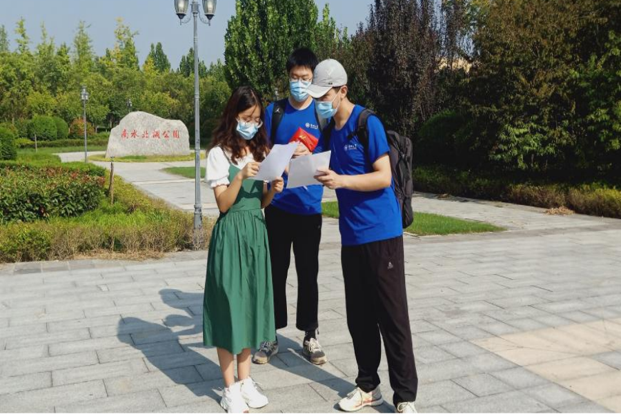 图为团队成员在南水北调公园实地调研并进行线下问卷调查。中国青年网通讯员 刘晴 供图