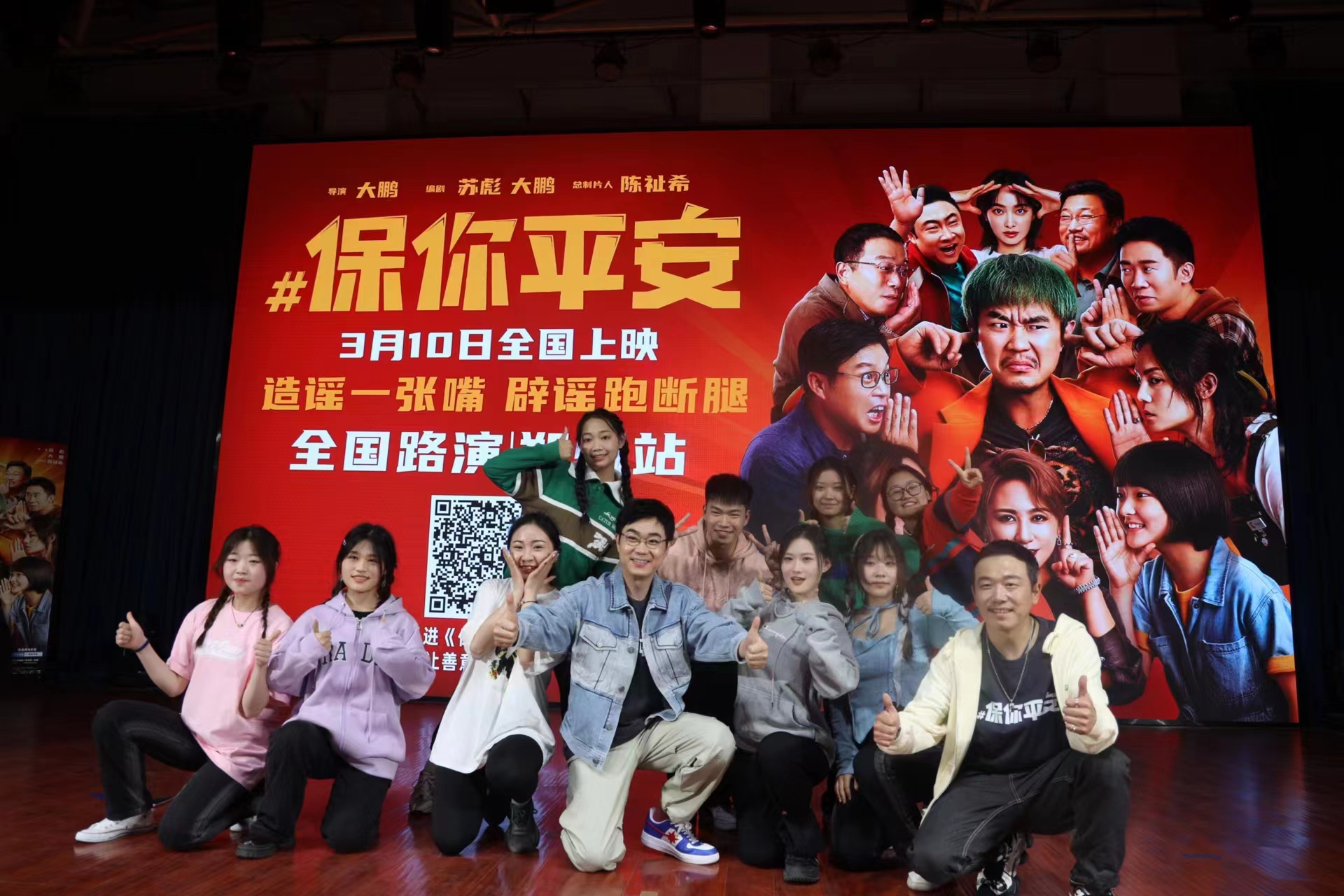 中国青年网郑州3月2日电(通讯员 张钰梓)为宣传最新作品,3月2日电影《保你平安》主创交流活动走进郑州大学。当晚,导演大鹏与演员潘斌龙来到郑州大学大学生活动中心三楼报告厅,与到场的学生围绕电影情节、创作经历等进行交流。18 时许,影片开始放映。电影富有喜剧色彩的同时也蕴含着深刻的道理,同学们观影过后也踊跃发言,分享感悟。本次路演活动给同学们留下了深刻印象,电影主人公“平安哥”的精神也将持续鼓舞同学们秉好心、行好事、做好人。