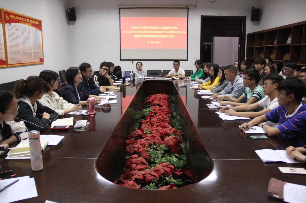 5月6日,郑州大学青年马克思主义者培养学校于主校区大学生活动中心会议室举办学习习近平总书记在纪念五四运动100周年大会上的重要讲话精神特别主题团日活动。校团委书记冀娟和青马学校全体学员参加特别主题团日活动。