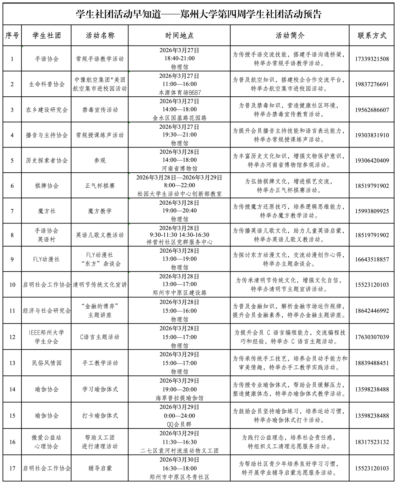 为了丰富校园文化生活,增强学生社团的凝聚力和影响力,促进学生的成长和发展,我校学生社团将举办一系列精彩纷呈的活动,现将本周(3.24-3.30)学生社团活动安排预告如下: