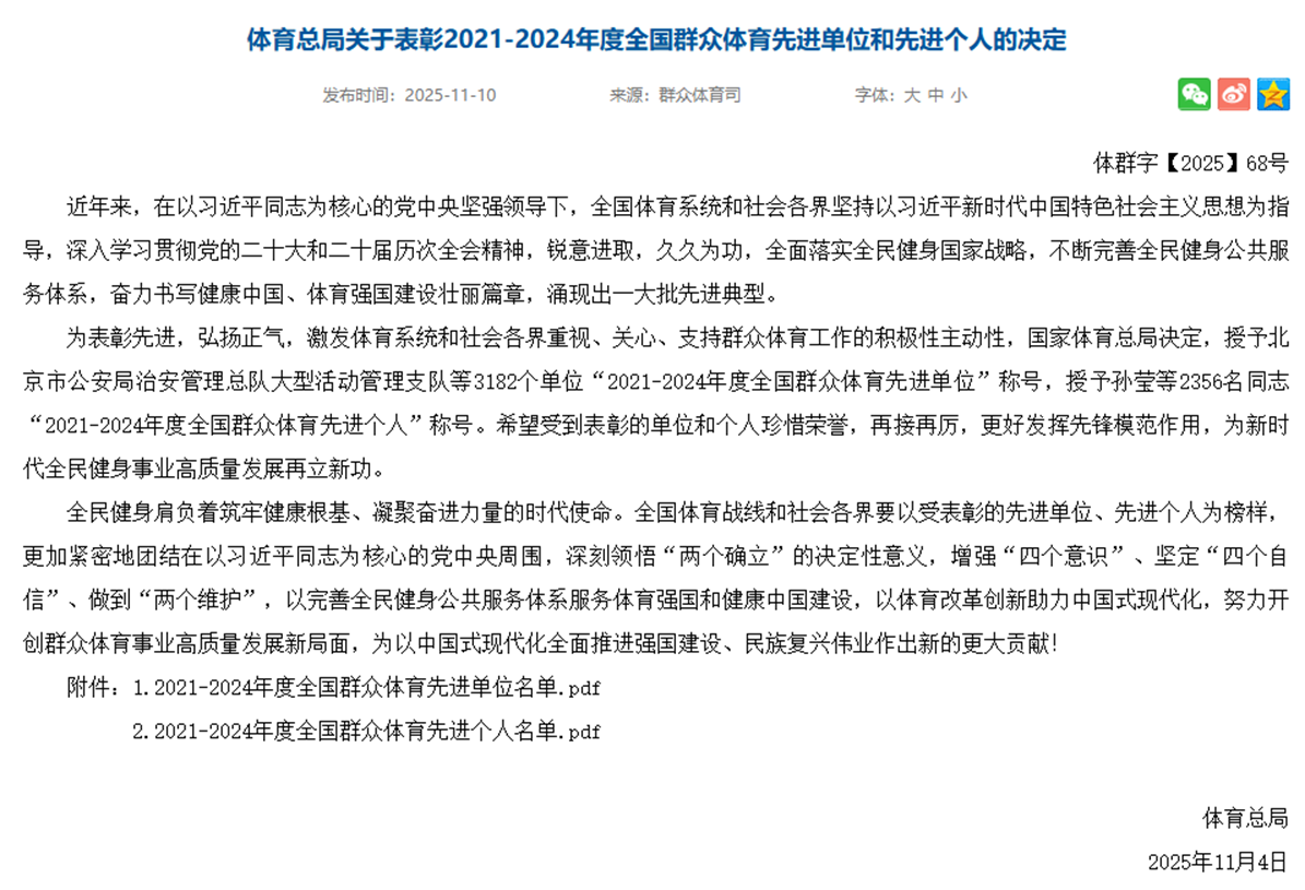 近日,国家体育总局发布《关于表彰2021—2024年度全国群众体育先进单位和先进个人的决定》,郑州大学运动与体育学院副院长司红玉荣获“全国群众体育先进个人”称号。