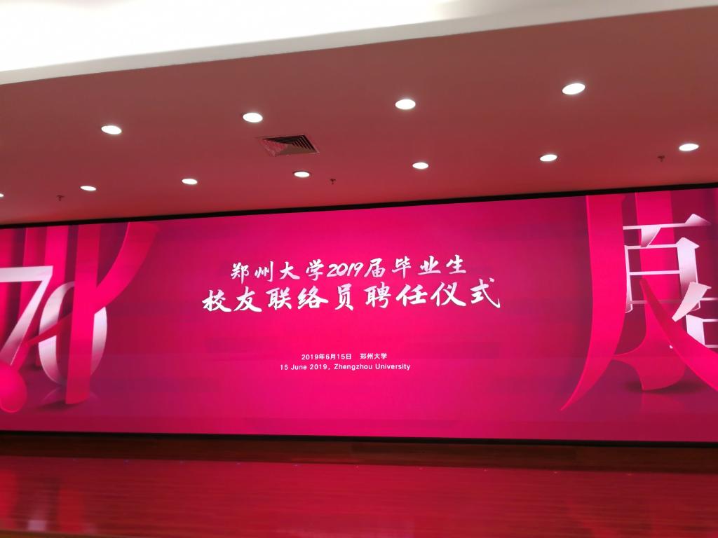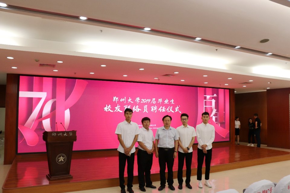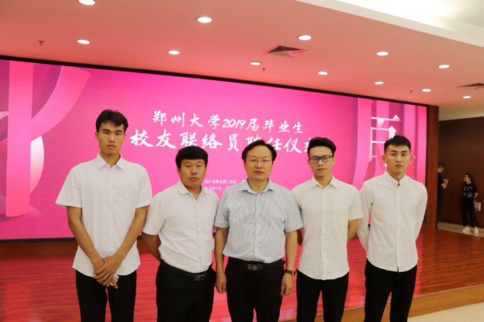6月15日下午14:00,第二报告厅,郑州大学2019届毕业生校友联络员聘任仪式,各单位校友工作分管领导、专员以及2019届毕业生校友联络员参加。我院学生联络员4人,其中2016级硕士生徐战争,2015级本科生王晨曦、李航奇、李佩远。
