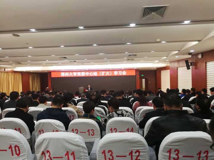 郑州大学党委中心组(扩大)学习会,2019.03.21.下午三点,地点在学校第二报告厅,校领导出席,扩大与会人员:中层单位党政一把手、副书记及团委书记。