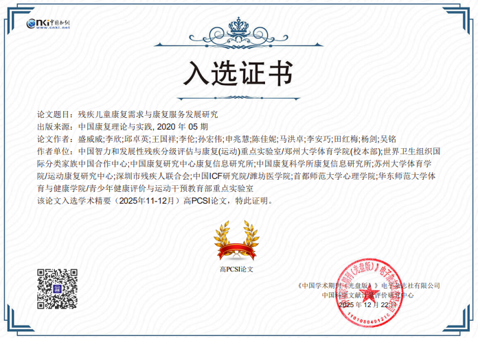 近日,国家科学技术部中国科学技术信息研究所(以下简称“中信所”)公布了2024年度“领跑者5000——中国精品科技期刊顶尖学术论文(F5000)”入选名单。我院与世界卫生组织国际分类家族中国合作中心、中国康复研究中心等机构合作完成的研究论文《残疾儿童康复需求与康复服务发展研究》成功入选。该论文发表于《中国康复理论与实践》2020年第5期,是我院在康复与健康服务研究领域取得的重要学术成果。