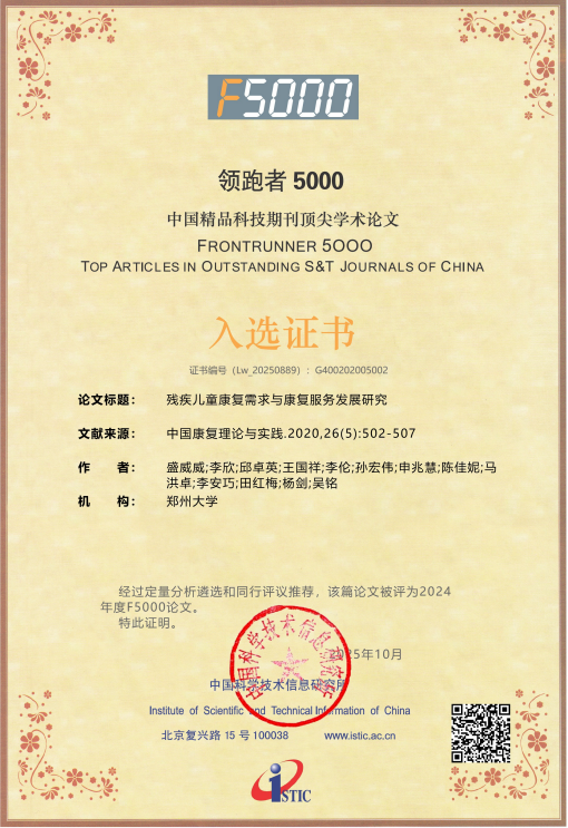 F5000是由中国科学技术信息研究所(国家科技部直属的权威信息研究机构)启动的国家级项目。其宗旨在于遴选和展示发表在中国精品科技期刊上、最具国际影响力的顶尖学术成果,打造中国自主的学术品牌,推动我国优秀科技期刊和科研成果走向世界舞台。此次入选,是对我院在残疾康复与健康服务研究领域科研工作的高度肯定。