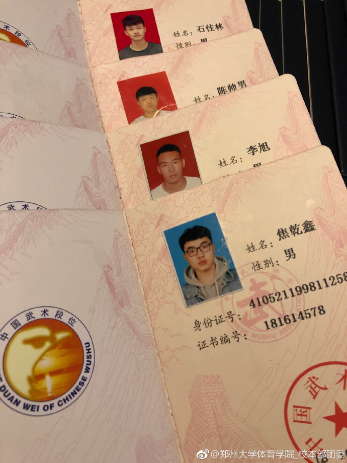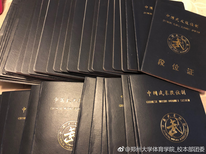 2018年12月18日,我院41名学生获得由河南省体育局武术管理中心核发的中国武术段位制一段证书及段位徽章。他们可申请2019年考核二段武术段位制。