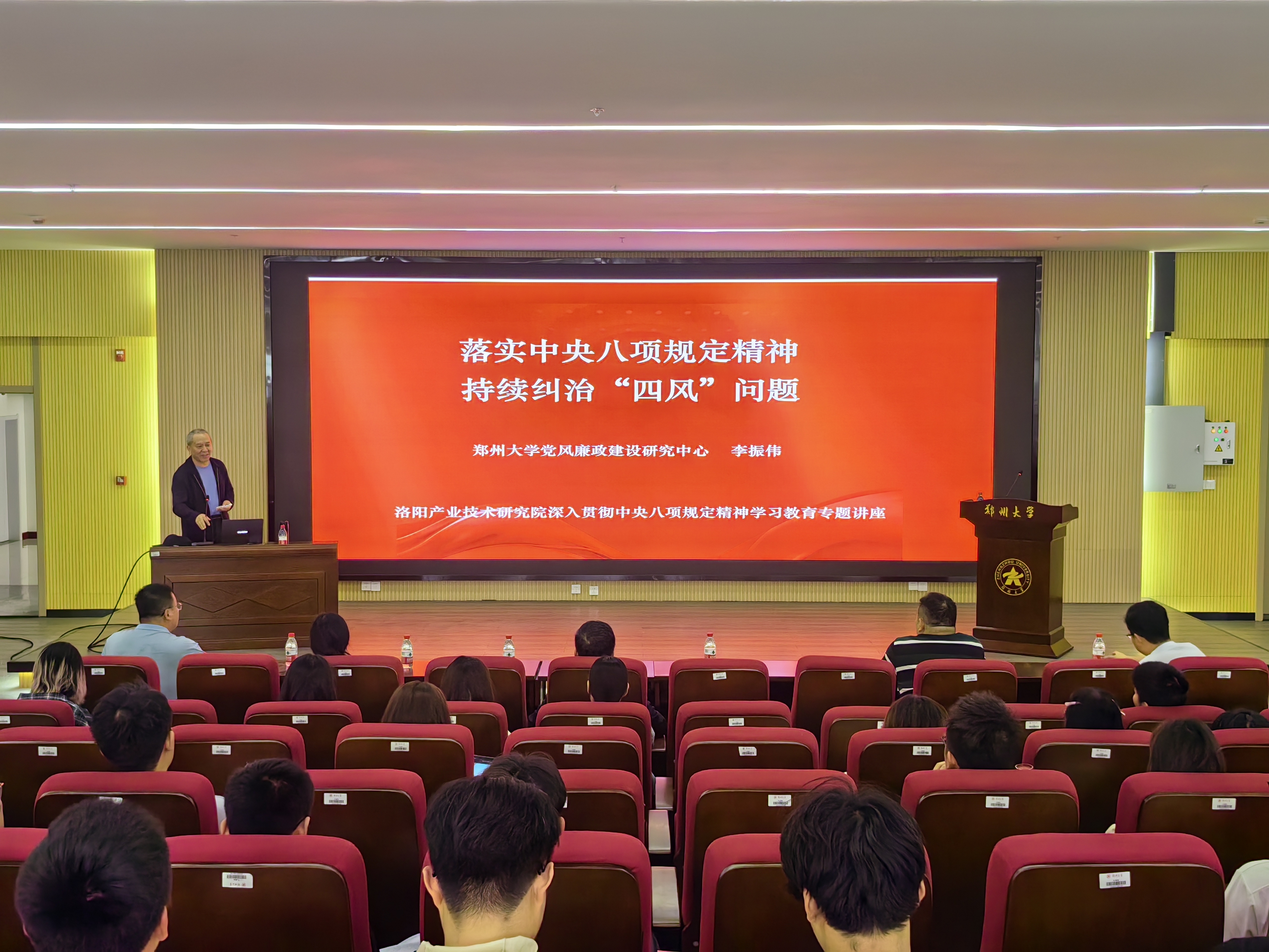 在集中报告环节,李振伟老师以《落实中央八项规定精神持续纠治“四风”问题》为题,结合习近平总书记关于加强党的作风建设的重要论述和本人开展纪检监察工作的经验,通过“理论阐释+案例分析”的方式,系统解读了中央八项规定精神的核心要义,深入剖析了形式主义、官僚主义、享乐主义和奢靡之风等“四风”问题的现实表现与危害。在报告中,李振伟老师对违反中央八项规定精神的典型案例进行了生动形象的分析和讲解,帮助在场师生进一步深化了对中央八项规定精神的理解和认识。