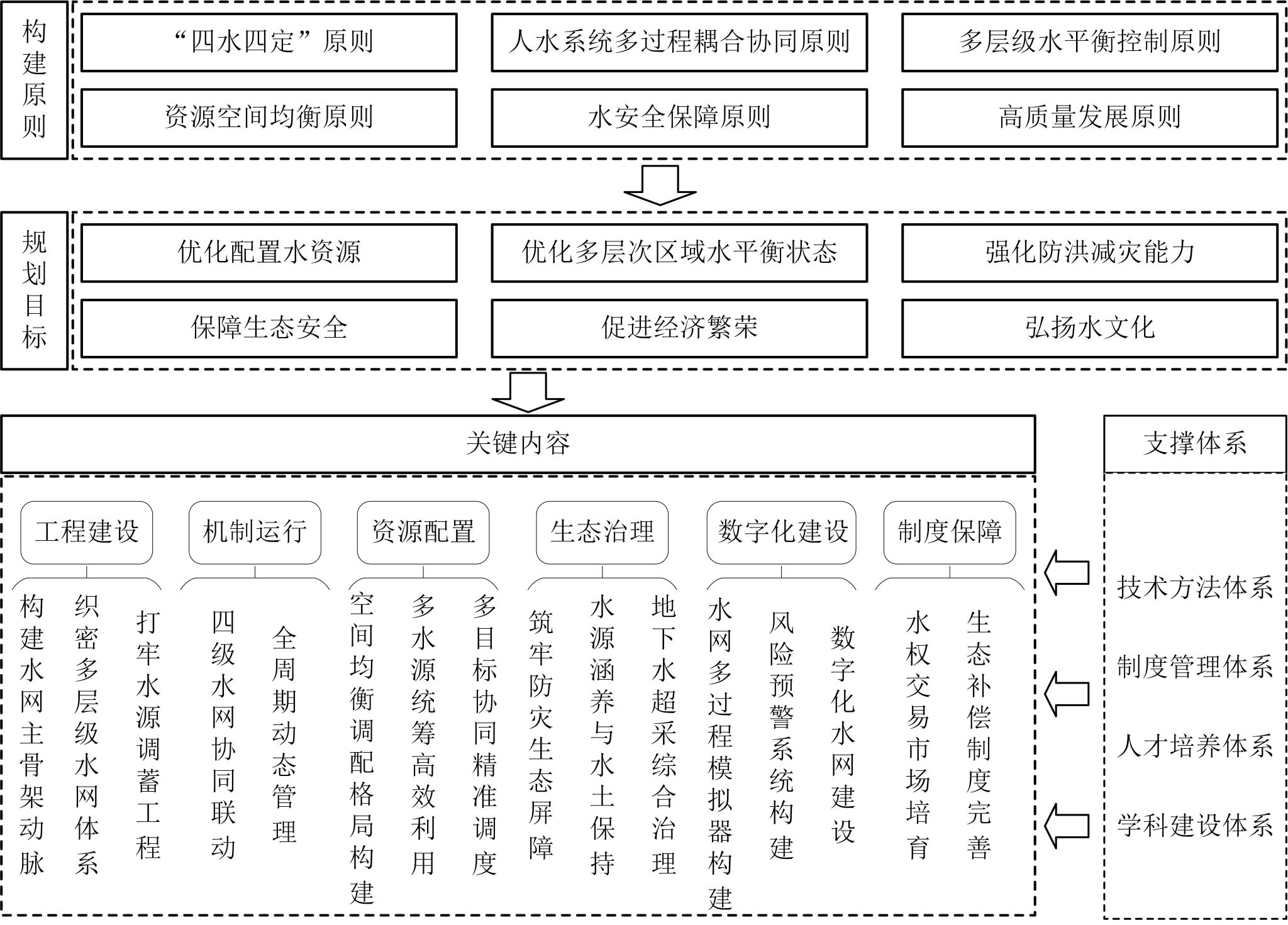 ②制度管理体系:建立健全完善的政策法规体系,明确水网规划、建设、管理及运营的标准与规范,确保工程安全与高效运行;强化水权市场改革,完善水价形成机制,发挥价格杠杆调节作用,促进水资源节约与高效利用;建立跨区域协调机制,促进水网工程区“一主四域”协同治理。