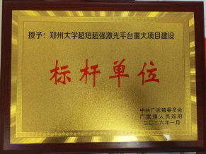 近日,因超短超强激光平台建设工作扎实推进、成效显著,圆满完成年度各项预期任务,平台所属地荥阳市广武镇党委、政府特向我校超短超强激光平台建设工作领导小组发来感谢信,并授予“标杆单位”荣誉称号。