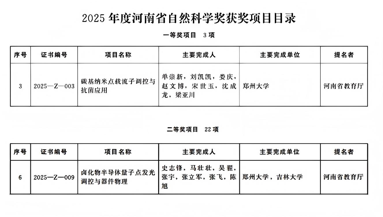 近日,河南省人民政府公布了2025年度河南省科学技术奖励名单,物理学院再创佳绩,以第一单位荣获河南省科学技术奖2项,其中河南省自然科学奖一等奖1项,河南省自然科学奖二等奖1项。