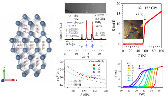 图1. 分子型二氢化铋超导体BiH2的晶体结构和超导转变。