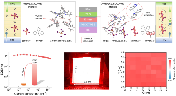 针对上述问题,我院研究人员在分子层面出发,提出一种全新的有机阳离子设计策略,构建了咔唑功能化的有机阳离子。该阳离子一方面能够与无机卤化物框架和溶剂分子形成强氢键相互作用,有效调控薄膜结晶动力学,从而获得致密、均匀、低缺陷密度的高质量发光层;另一方面,其咔唑单元可与电子传输层中的苯并咪唑结构产生显著的π-π堆积作用,改善界面能级匹配和分子耦合,促进电子在界面处的高效传输与注入。在材料发光性能提升与界面工程优化的协同作用下,研究团队成功制备出高性能锑卤化物LED器件,最大外量子效率达到19.4%,工作半衰期达到10190分钟,较以往报道水平实现了跨越式提升。这一成果不仅大幅缩小了光致发光效率与电致发光效率之间的差距,也为有机无机杂化金属卤化物在高效、稳定LED中的应用奠定了重要基础。