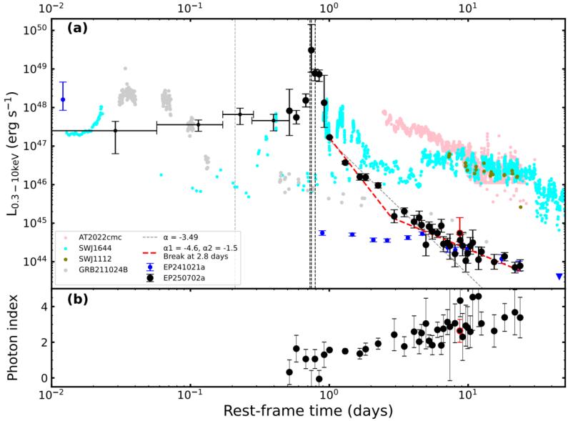 图2:(a)EP250702a的X射线光变曲线(黑色数据点)与其他暂现源的对比。其中包括有带喷流的潮汐瓦解恒星事件(如Sw J1644+57)、超长伽马射线暴(GRB 211024B)。EP250702a展现出前所未有的快速演化特征:其亮度在短短20天内骤降超过10万倍,远超其他同类事件。(b)EP250702a的X射线能谱随时间演化的趋势。光子指数从早期的约1(表示光谱很“硬”)显著增加到后期的3以上(表示光谱变“软”),这种清晰的“硬-软”转变是首次在此类事件中发现,暗示了后期可能有热辐射成分的涌现。图片来源:国家天文台天关卫星科学中心