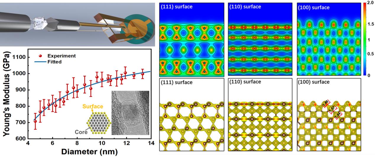 针对这一问题,团队利用自主发展的原位透射电子显微镜纳米力学测试方法,结合第一性原理计算和分子动力学模拟,系统研究了纳米金刚石的尺寸依赖弹性行为。研究发现,随着颗粒尺寸由约13纳米减小至约4纳米,其有效轴向杨氏模量由约1000 GPa明显降低至约700 GPa,表现出显著的尺寸依赖软化现象。进一步研究表明,这种刚度降低并非来自最外层表面原子的软化。相反,最外层表面原子层仍保持较强成键;真正主导纳米金刚石弹性变化的,是位于表面与晶体内核之间的亚表层界面区域。在这一过渡区域中,表面与内核之间的连接键被拉长、局域电荷密度降低,从而形成了力学上键合更弱的界面层。该区域在受力过程中更容易发生应变集中,并能够容纳更大的可逆形变,因此成为纳米金刚石高弹性的重要结构来源。
