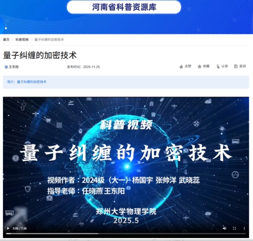 日前,我院2024级物理学类杨国宇、张帅洋、武晓蕊三位本科生(指导老师:任晓燕副教授、王东阳副研究员)创作的科普视频《量子纠缠的加密技术》成功入选河南省科普资源库(前沿科技板块),这是我院学生科普视频作品首次入选该科普资源库。