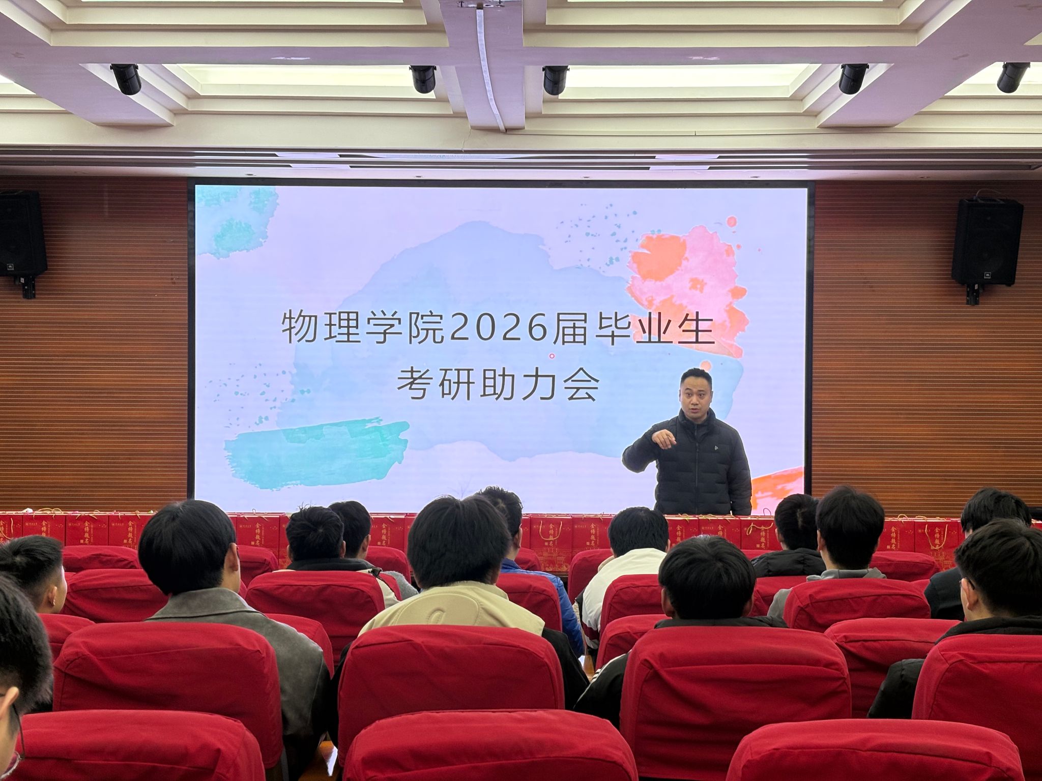 2026年全国硕士研究生招生考试即将到来,为帮助考研学子缓解备考压力、增强冲刺信心,我院于12月10日晚在物理B楼107报告厅举办2026届毕业生考研助力活动,现场发放“考研加油包”,为即将步入考场的学子送上学院的温暖与祝福。院党委副书记王逸楠、本科生辅导员参加此次活动,与学子们共同迎接这一暖心时刻。