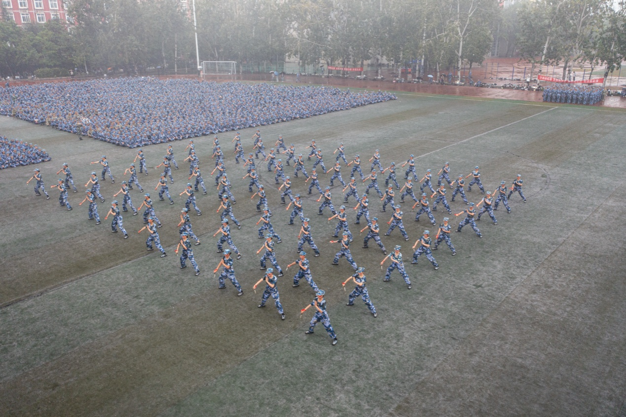 “标兵就位!”“分列式开始!”号令发出,24个军训连方队,如钢铁洪流,踏浪前行。同学们口号震天、步伐整齐,雨中挺拔的身姿更显刚毅。军事科目表演精彩纷呈:刺杀操迅猛凌厉,突刺格挡间彰显敢打必胜的坚定信念;军体拳气势磅礴,拳风腿影中展现敢于亮剑的战斗精神;女子匕首操刚柔并济,招招式式诠释巾帼不让须眉的飒爽豪情。雨水浇不灭斗志,更燃起全场激情。声声喝彩,阵阵欢呼,标志着全体新生将以此为序,迈出践行“求是 担当”郑大精神的坚实步伐。