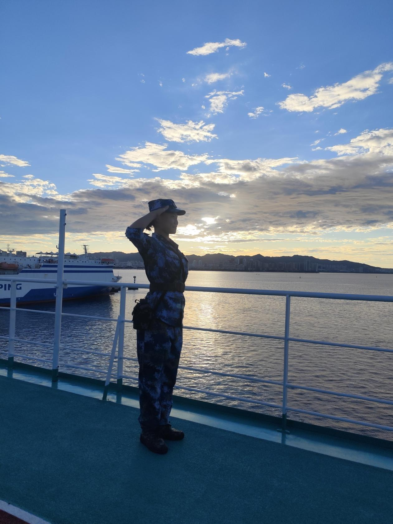 从青岛港到威海港,王灿的海上征程充满挑战。但她始终以坚定意志认真学习航海知识、核生化防护、战场救护及星空识别等专业技能——为记牢航法规则,她把要点写在手腕上;防护训练中反复打磨动作,直至形成肌肉记忆。刺杀操训练中,她任凭汗水滚落,身姿始终挺拔,眼神坚定如炬;首次实弹射击,枪械后坐力令手臂发麻,却更燃起她持续练习的决心。13.14公里的徒步行军拉练中,王灿身负全套作训装备,顶烈日前行,《强军战歌》悄然响起,她放声高歌,并放缓脚步鼓励同伴,用歌声与行动凝聚团队力量。
