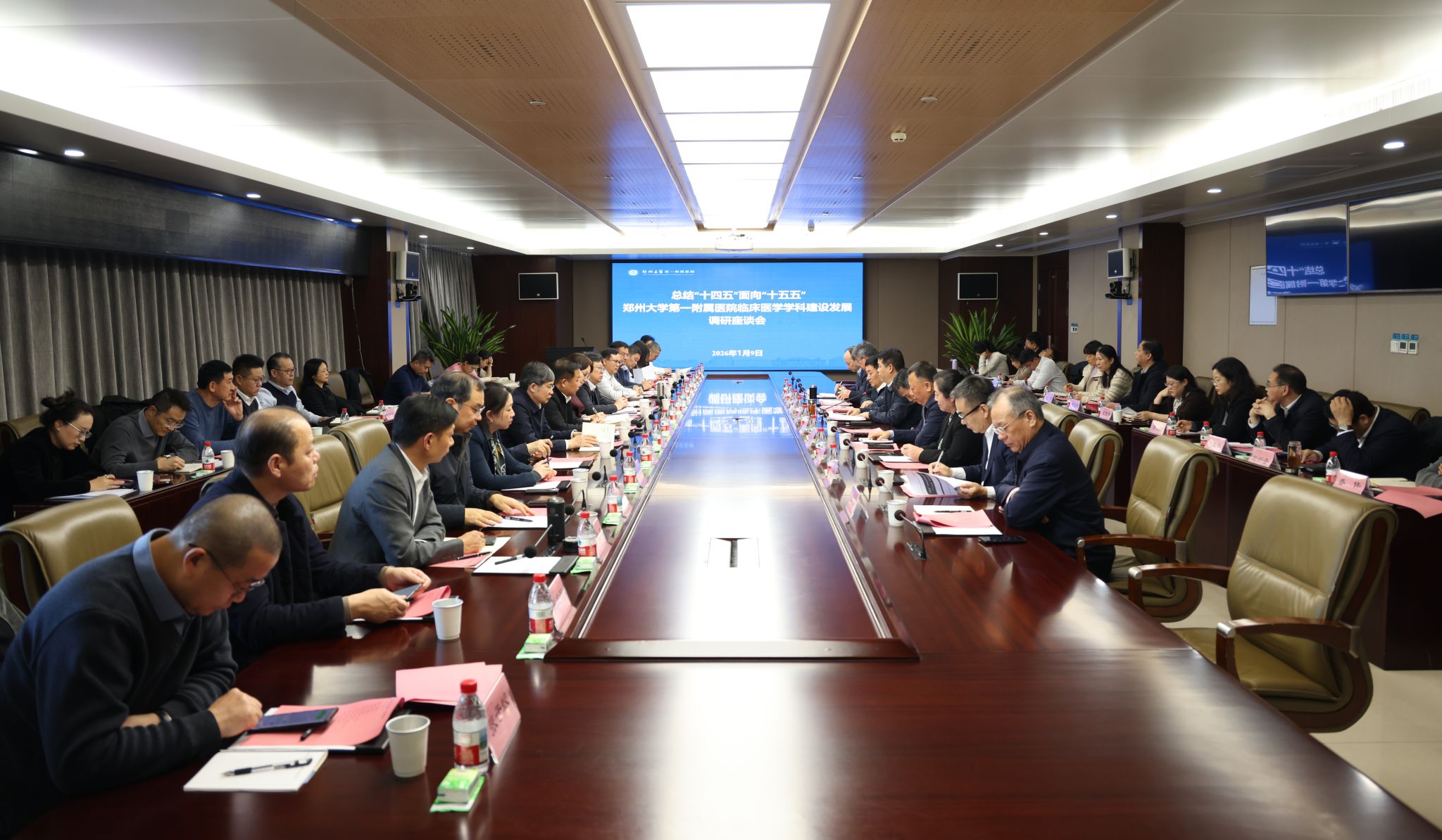 1月9日,校长李蓬院士到第一附属医院郑东院区调研,召开临床医学学科建设发展座谈会。校领导徐东升、刘春太、王海杰、臧双全,学术副校长姜勇,第一附属医院党委书记王福伟、院长余祖江,学校相关职能部门、河南医学院负责同志,第一附属医院、第一临床医学院有关负责同志参加座谈会。会议由校党委副书记王利国主持。