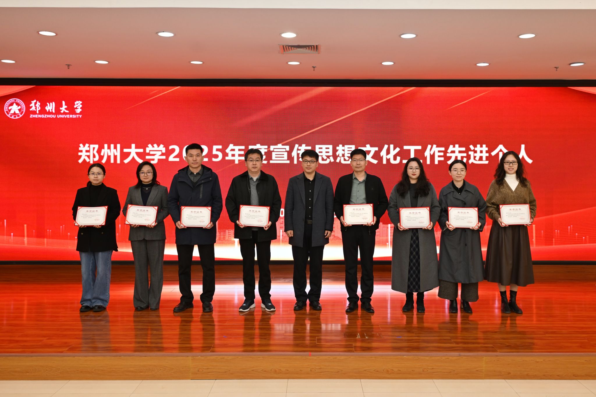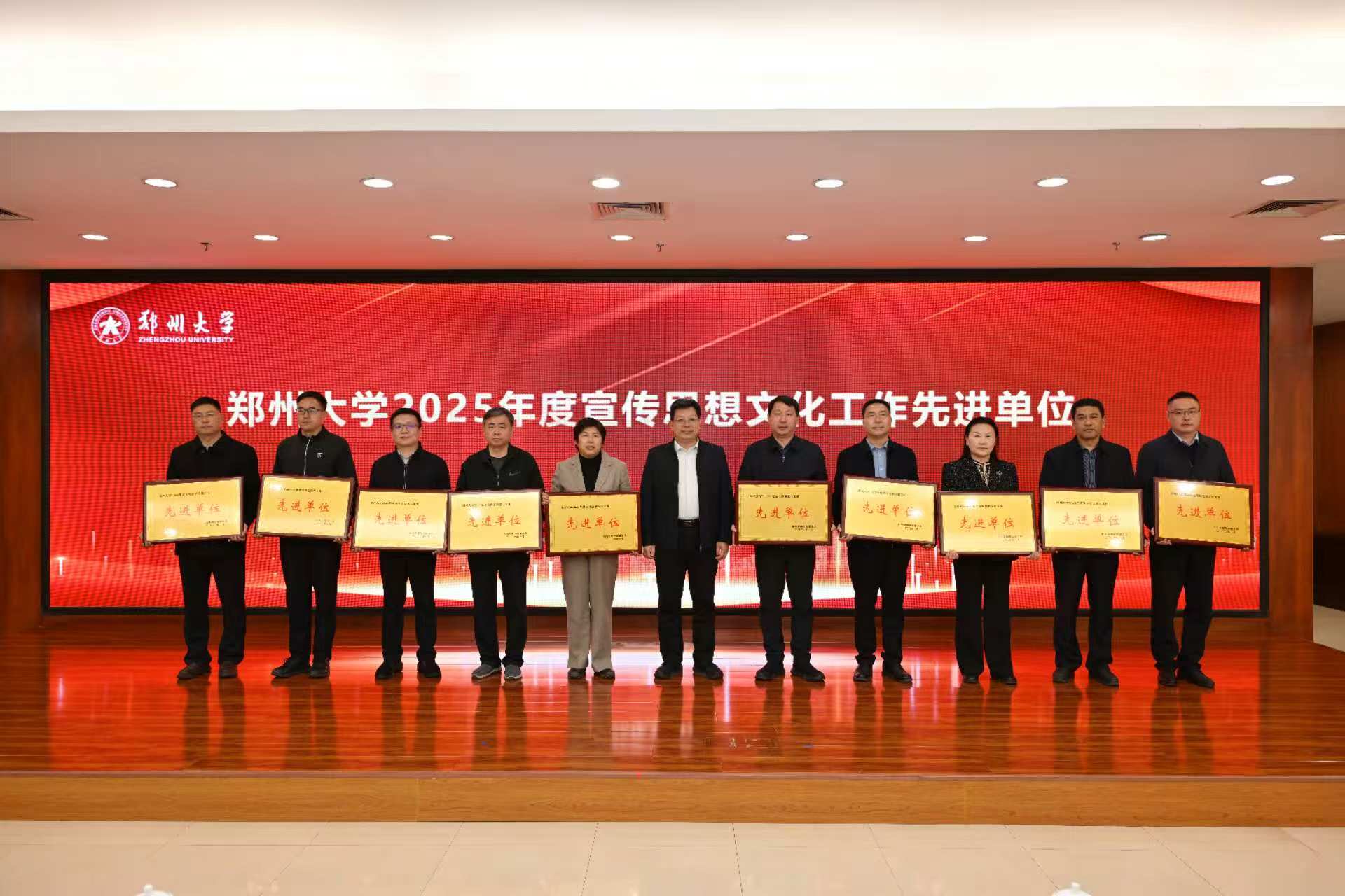 与会领导为先进单位和先进个人进行颁奖。校工会蝉联2025年度郑州大学宣传思想文化工作先进单位,郭二锋同志荣获宣传思想文化工作先进个人。