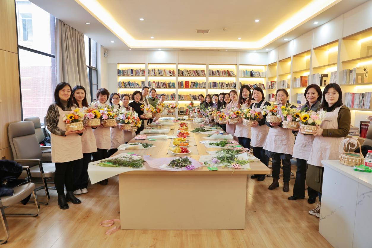 活动特邀专业花艺师指导,学院20余名女教职工通过识花、剪枝、配色等环节,精心构思,亲手创作出错落有致、生机盎然的手提花篮。学院党委书记陈晓伟教授,正处级组织员、副院长(主持工作)张淑华教授到场参与,向全体女教职工致以节日的诚挚问候和美好祝福,并对活动创意与组织给予高度评价。