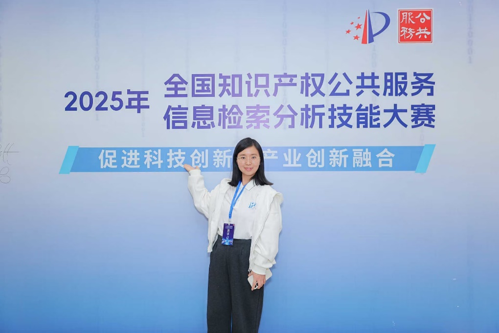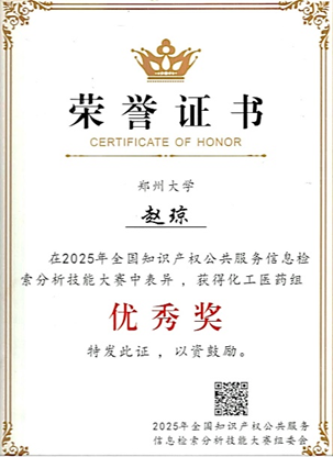 近日,由国家知识产权局举办的2025年全国知识产权公共服务信息检索分析技能大赛在江苏南京圆满落幕。大赛吸引了全国范围1000余名选手参赛,最终评选出一等奖6名,二等奖12名,三等奖18名,优秀奖24名。在此次强手如林的全国竞赛中,我校图书馆查新站赵琼,凭借扎实的专业知识及娴熟的检索技巧荣获化工医药组优秀奖。