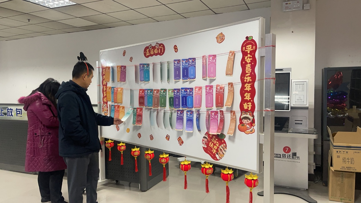 闻讯而来的教职工们络绎不绝,大家围聚在书写桌前,或驻足欣赏笔墨创作的艺术魅力,或与书法家悉心沟通,定制专属的新春祝福。接过红彤彤春联、福字,大家脸上笑意盈盈,无不称赞书法家的技艺精湛,并表示这样的手写春联比买来的更有温度,更有浓浓的年味,特别有意义!活动现场还设有猜灯谜的互动环节,大家有的苦思冥想,有的眉开眼笑,整个现场都沉浸在一派热闹、祥和的气氛中。