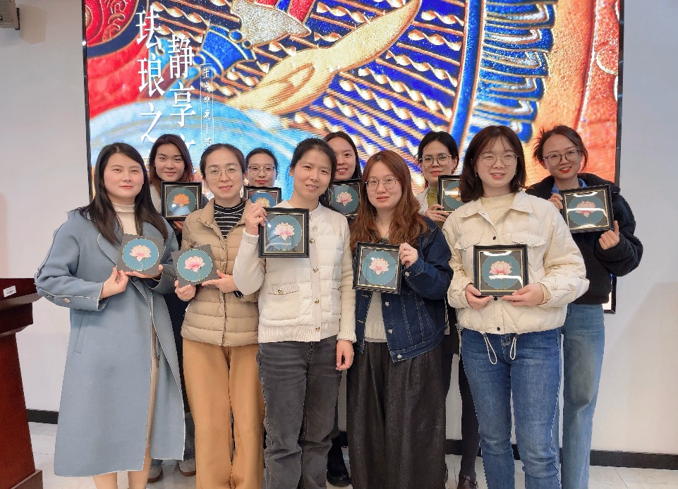 活动现场布置雅致,金丝、彩砂、画板等材料整齐陈列,氤氲着浓厚的艺术氛围。特邀的“非遗”工艺专业老师首先为大家系统讲解了掐丝珐琅的历史渊源与文化价值。作为列入国家级非物质文化遗产名录的传统技艺,其集冶金、铸造、绘画等多种工艺于一体,自古便有 “一件景泰蓝,十箱官窑器”的美誉。老师结合实物演示,详细拆解了描图、掐丝、点蓝、固砂等核心工序,重点指导了铜丝弯折力度控制、彩砂填充均匀度等实操技巧,让科研工作者们快速掌握了这门古老技艺的入门要领。在实操环节,女老师们化身“非遗传承人”,将科研工作中精益求精的态度融入手工创作。大家专注地用镊子夹起细如发丝的铜丝,沿着图案轮廓精准弯折、粘贴,再小心翼翼地挑选彩砂填充缝隙,原本单调的画板逐渐绽放出绚丽光彩。过程中,老师们相互交流经验、分享创意,遇到难题时主动向老师请教,现场气氛热烈而温馨。每一件作品都凝聚着创作者的巧思与匠心,彰显着科研女性的多元风采。