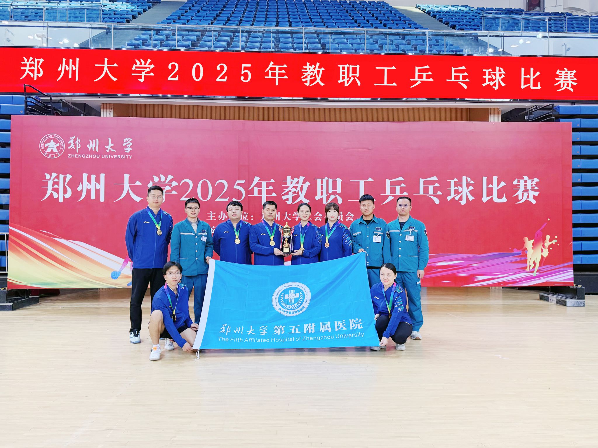 11月29日至30日,郑州大学2025年教职工乒乓球比赛在主校区中心体育馆举办。本次比赛由郑州大学工会委员会主办,郑州大学运动与体育学院承办,吸引了全校51个院系及直属单位的500余名教职工参加,场面盛大,气氛热烈。经过两天的激烈角逐,郑州大学第五附属医院代表队凭借精湛的球技和出色的发挥,一路过关斩将,最终蝉联混合团体冠军,充分展现了五附院教职工团结协作、奋勇争先的精神风貌。