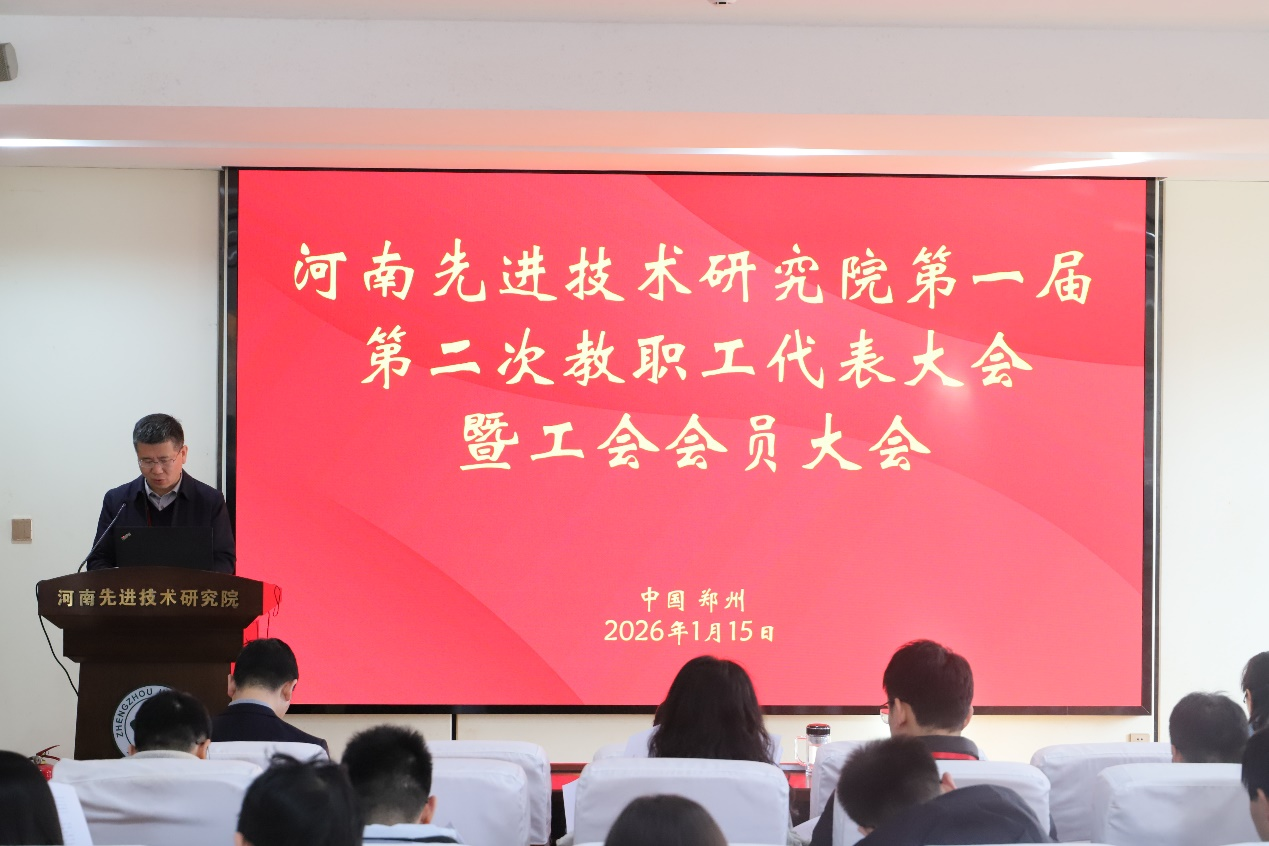 为深入学习贯彻习近平新时代中国特色社会主义思想,贯彻落实党的二十大和二十届四中全会精神,全面总结学院发展成效,科学谋划未来发展方向,河南先进技术研究院于1月15日上午在先进院一楼学术报告厅召开了我院第一届第二次教职工(工会会员)代表大会。河南先进技术研究院党委书记许群,院长孙钢灿,党委副书记、纪委书记华利民,副院长、工会主席裴红星及先进院全体教职工参加了本次会议。