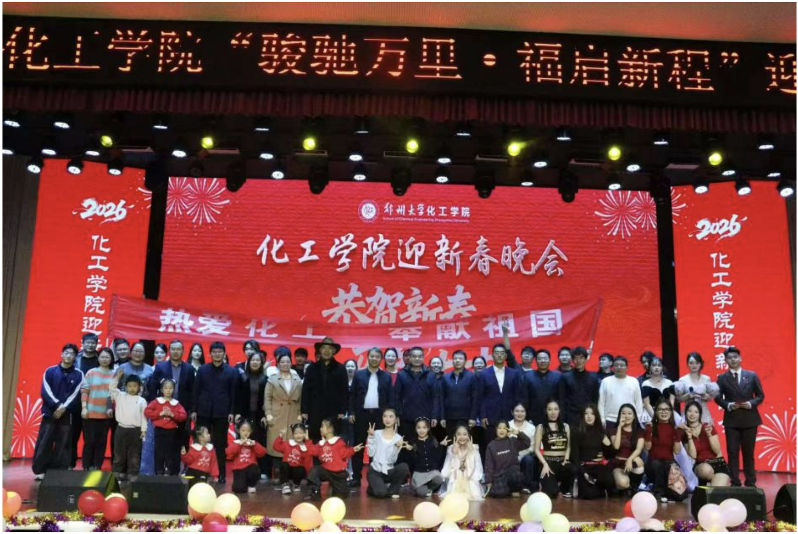1月23日,化工学院“骏驰万里·福启新程”2026年迎新春晚会在郑州大学大学生活动中心三楼报告厅举行,此次活动由学院团委和工会联合组织,学院党政领导班子成员、校友代表、学院师生欢聚一堂,共迎新春,在欢声笑语中回顾奋进征程,展望崭新篇章。