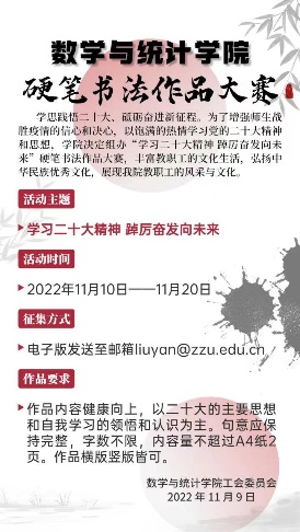 学思践悟二十大、砥砺奋进新征程。为了增强师生战胜疫情的信心和决心,以饱满的热情学习党的二十大精神和思想,数学与统计学院工会于2022年11月10-25日,组办了“学习二十大精神,踔厉奋发向未来” 教职工硬笔书法作品大赛。评选出教职工优秀硬笔书法作品9份,丰富教职工的文化生活,弘扬中华民族优秀文化,展现我院教职工的风采与文化。