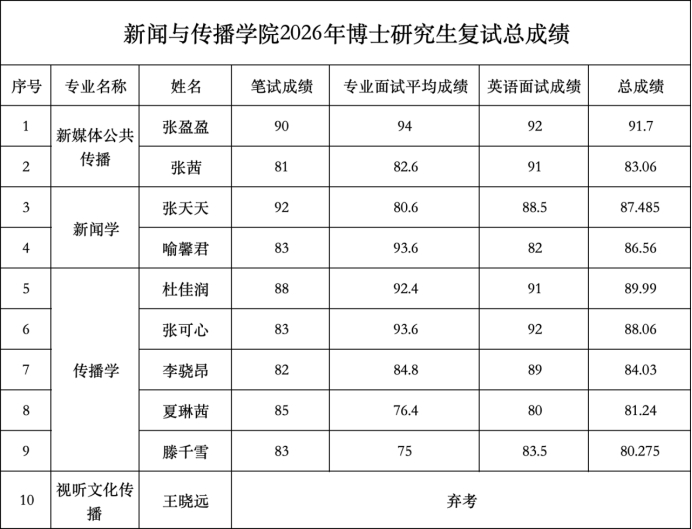 新闻与传播学院2026年博士研究生综合考核结果公示