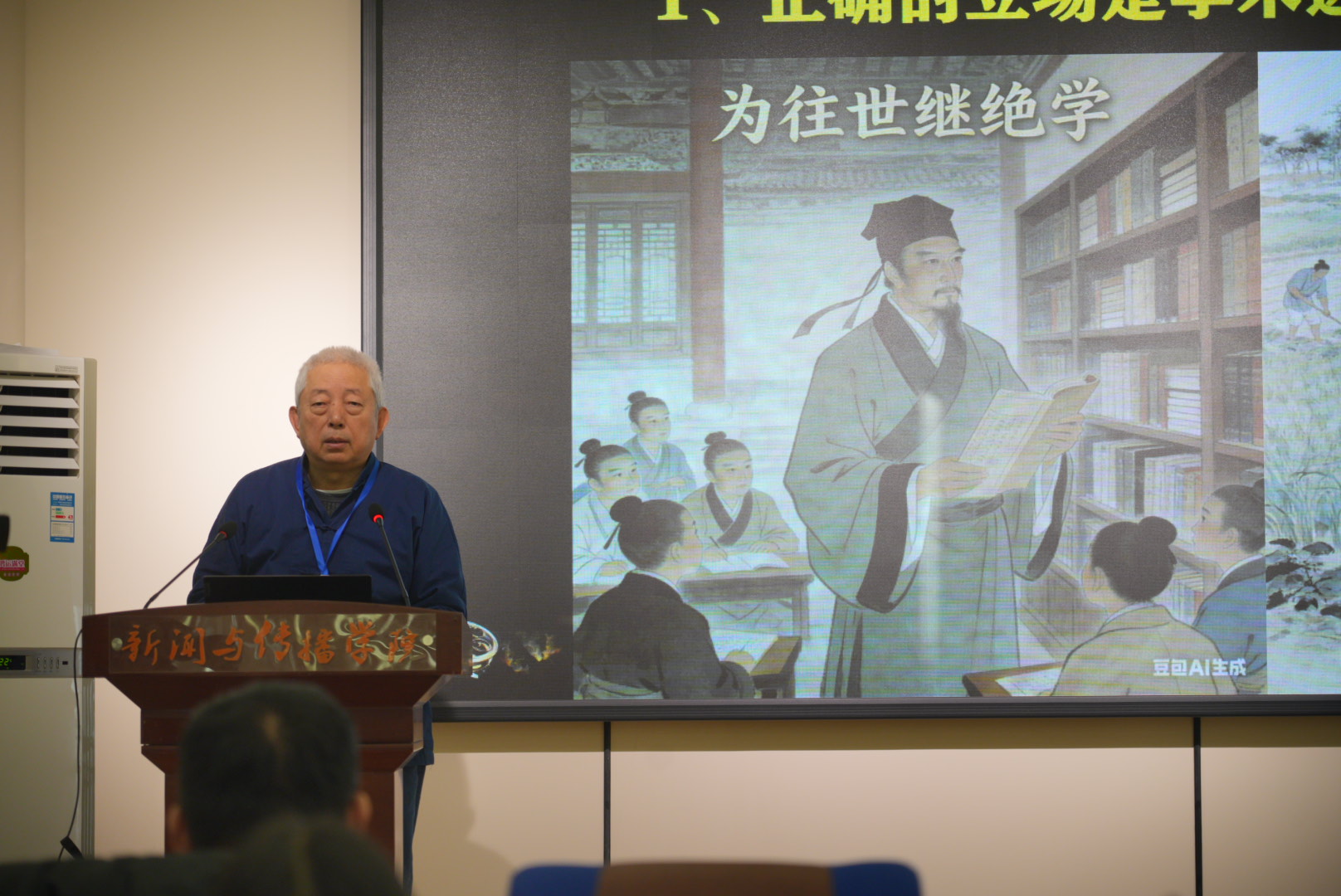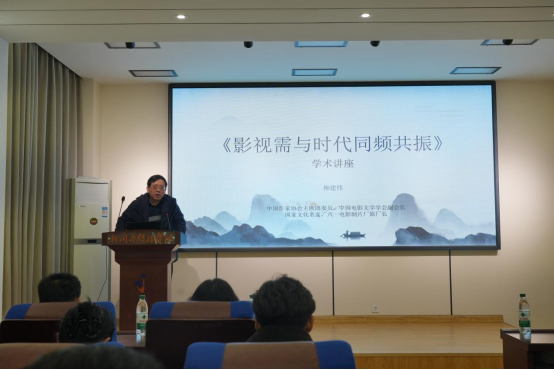 当晚19:00,晚间学术讲座开启,郑州大学新闻与传播学院415报告厅座无虚席。中国作家协会主席团成员、中国电影文学学会副会长、国家文化名家、八一电影制片厂原厂长柳建伟以《影视需与时代同频共振》为题展开分享,首先他对微短剧的盛行原因进行分析,并期望微短剧的焕新能为地区发展提供经济助力、文化活力。其次,对于影视与文化的关系,他提出文学是影视的基础,影视是对当代文化的阐释,并探讨了文学改编对于影视创作的可能性。