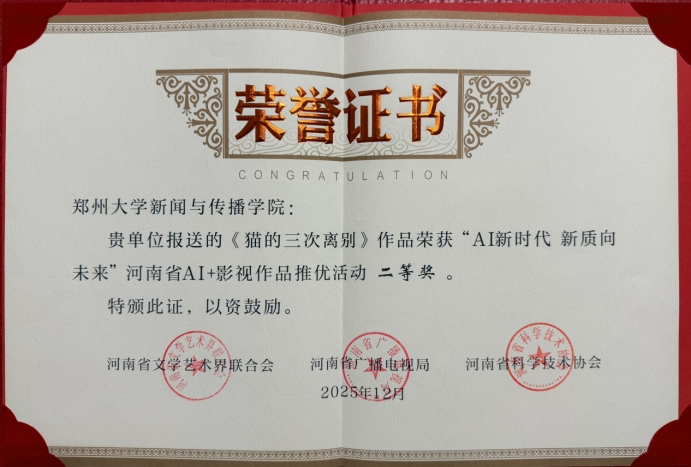 由陈晓伟教授指导,2025级戏剧与影视专硕研究生王亚旭、周肸果创作的《猫的三次离别》荣获二等奖。