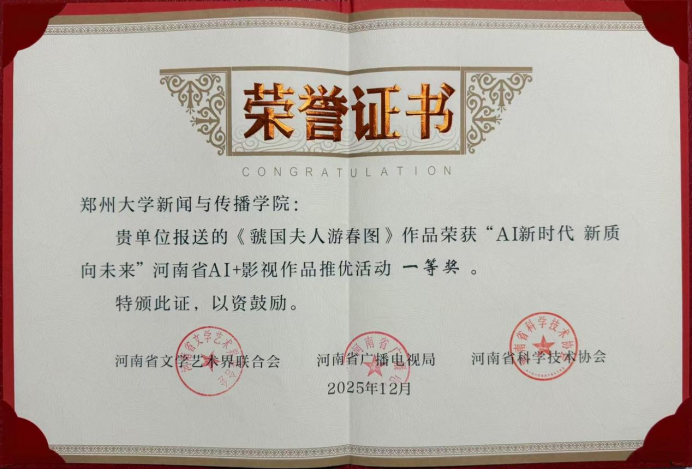 由陈晓伟教授担任导演,张宁老师统筹,2025级戏剧与影视专硕研究生王亚旭、贺湘溢、周肸果、冯亚琳,本科生韦颖祺,中国传媒大学硕士研究生刘大雨联合创作的作品《虢国夫人游春图》荣获一等奖;