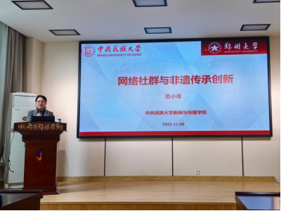 2025年11月8日上午,郑州大学新闻与传播学院研究生名师名家讲坛第92期在学院415报告厅举行。中央民族大学新闻与传播学院教授、博士生导师范小青应邀作题为《网络社群与非遗传承创新》的专题讲座。本次讲座由我院褚金勇老师主持,2025级硕士研究生参加。