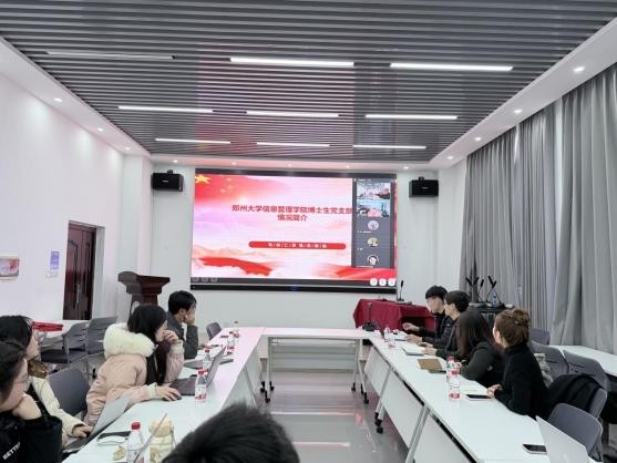 2025年12月24日下午,郑州大学信息管理学院博士生党支部与扬州大学社会发展学院博士生党支部、研究生第一党支部,以“线下+线上”相结合的方式,在郑州大学信息管理学院201报告厅联合举办“联学共建强党性 协同奋进谱新篇”主题党日活动。活动旨在深入学习贯彻党的二十届四中全会精神,推动跨校联学共建走深走实,促进党建与科研深度融合。郑州大学信息管理学院博士生党支部书记王清飞主持本次活动,双方党支部成员通过线下会场与线上平台同步参与。