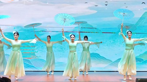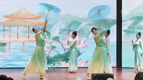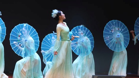 比赛当日,伴随着背景音乐潺潺的流水声,我院舞者手持油伞,身着淡青色古装舞裙,从舞台两侧翩然入场,以灵动的舞姿赢得评委与观众的一致赞赏,现场气氛热烈,掌声不断。该作品以“江南春日,西子湖畔初露新颜”为主题,通过舞蹈语言还原“水光潋滟晴方好”的诗意画面,将西湖初春的清新雅致与温柔灵动完美融合,让人仿佛置身烟雨江南的唯美意境。