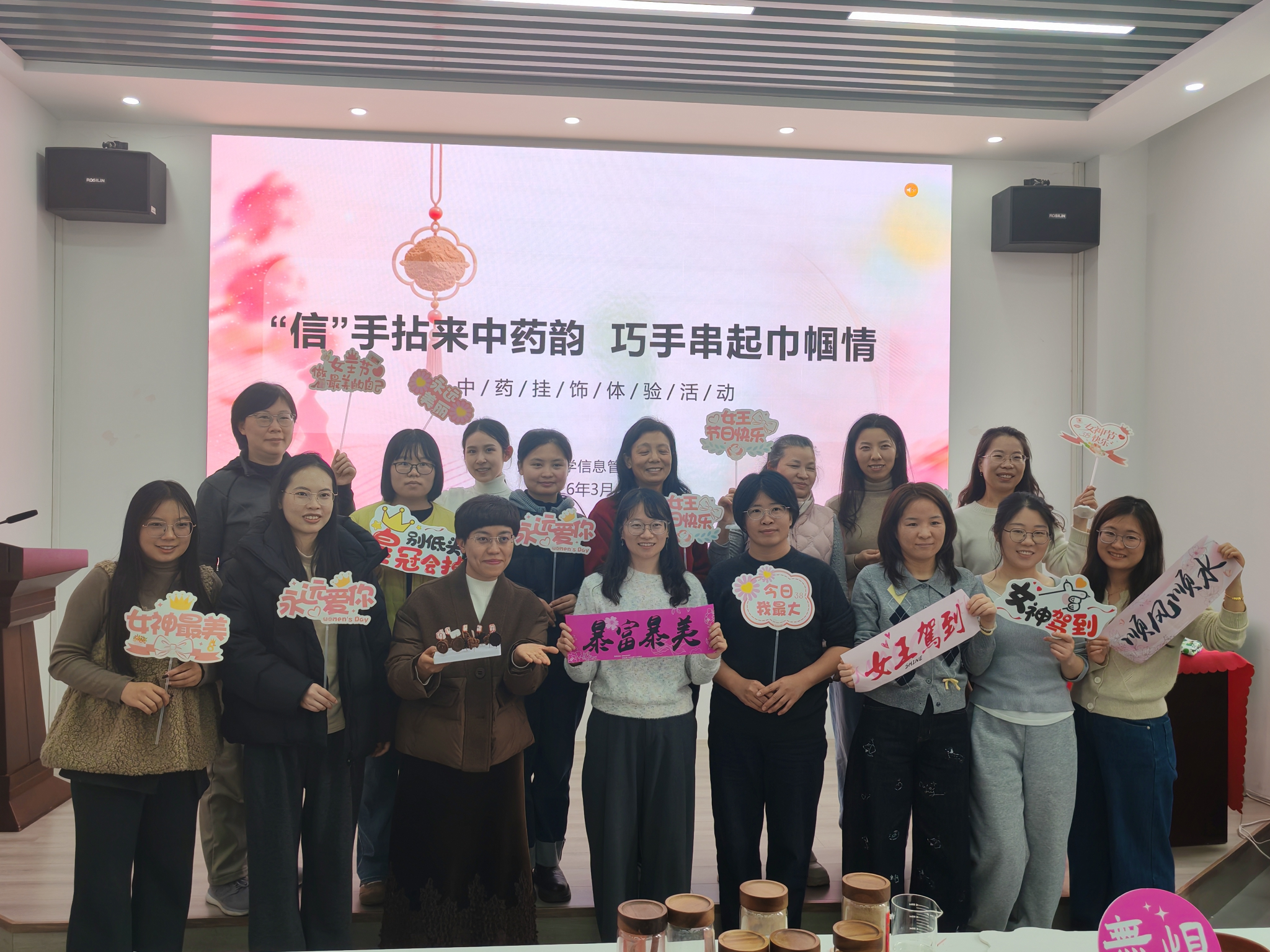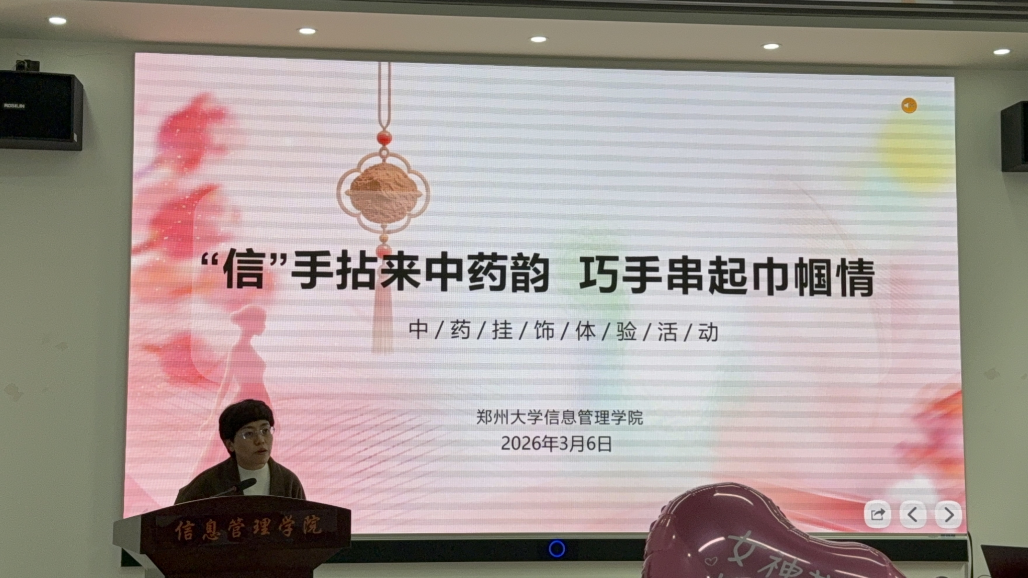 2026年3月6日下午,在第116个“三八”国际妇女节来临之际,郑州大学信息管理学院女工委举办了以“‘信’手拈来中药蕴,巧手串起巾帼情”为主题的“三八节”庆祝活动。学院党委书记许立敏、工会主席郎春林现场慰问,女工主任邢变变主持活动,全院女教职工欢聚一堂,在中药挂饰手作中感受传统文化的魅力,共度了一个香气氤氲、意蕴悠长的午后时光。