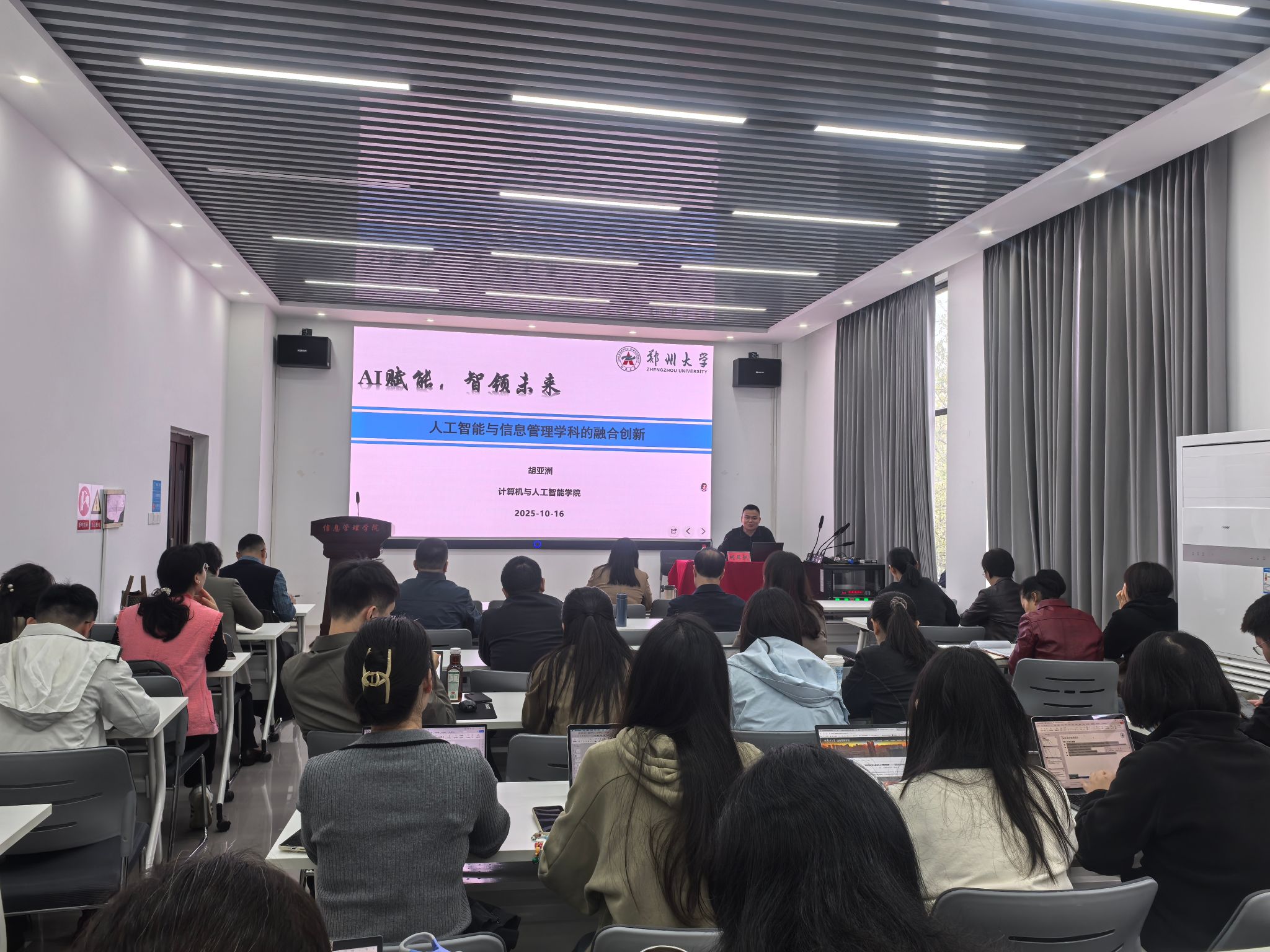 10月16日,学院特邀郑州大学计算机与人工智能学院直聘副高、硕士生导师胡亚洲以“AI赋能,智领未来:人工智能与信息管理学科的融合创新”为题开展报告。报告会于学院201报告厅举行,全体教职工参加,副院长孙大东主持。