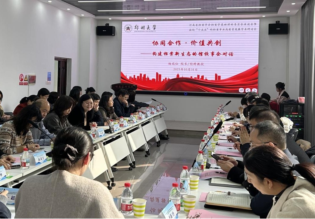 为探讨“十五五”期间档案事业的发展路径,构建协同合作的新生态,2025年10月31日上午,档案基础理论与档案文化专业委员会座谈会暨“十五五”馆校事企协同合作与高质量发展学术研讨会在郑州大学信息管理学院成功举办。会议以“协同合作与价值共创:构建档案事业新生态的馆校事企对话”为主题,旨在通过深度交流,凝聚发展共识。会议汇聚了河南省档案学会理事长翟霣远、秘书长刘雪梅,以及河南省档案学会档案基础理论与档案文化专业委员会主任委员杨瑞仙、各位副主任委员、委员等众多档案领域的领导与专家,共襄盛举。本次会议由郑州大学信息管理学院副院长、河南省档案学会档案基础理论与档案文化专业委员会副主任委员孙大东主持。