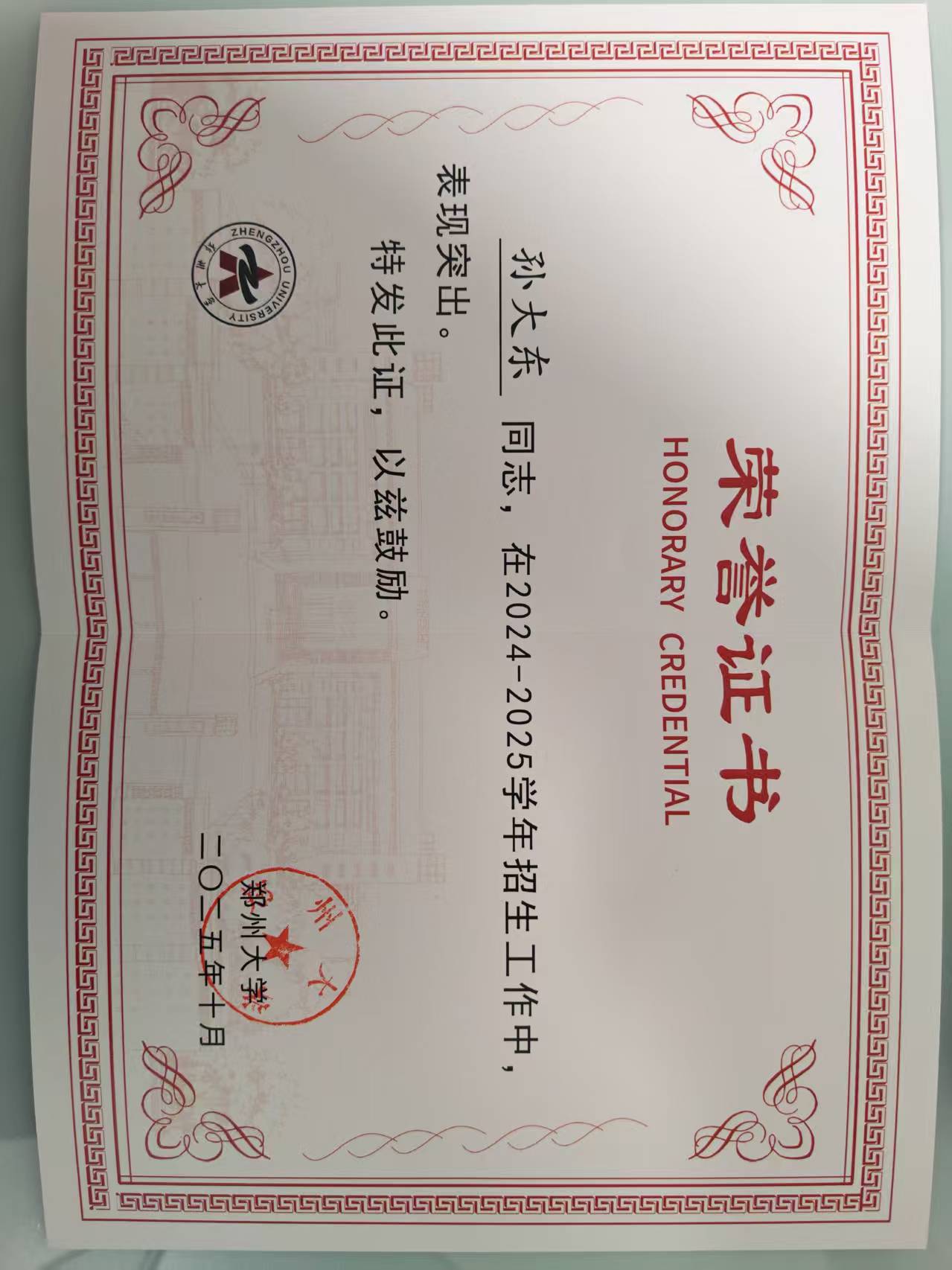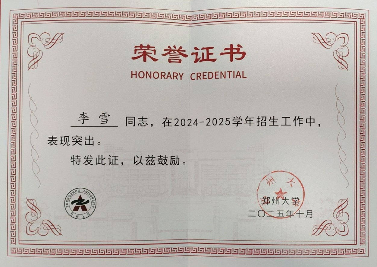 11月12日,学校召开“郑州大学2024-2025学年本科招生工作总结会”,会上表彰了2024-2025学年本科招生工作先进单位以及本科招生工作先进个人。我院荣获“本科招生工作先进单位”荣誉称号,我院副院长孙大东、李雪老师荣获“本科招生工作先进个人” 荣誉称号。