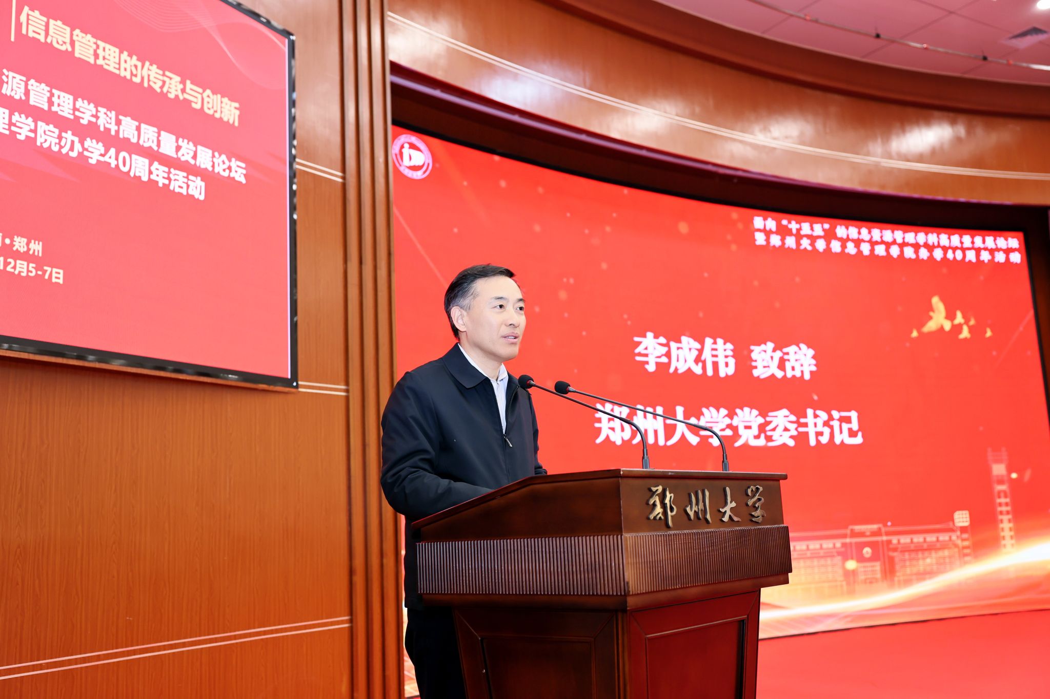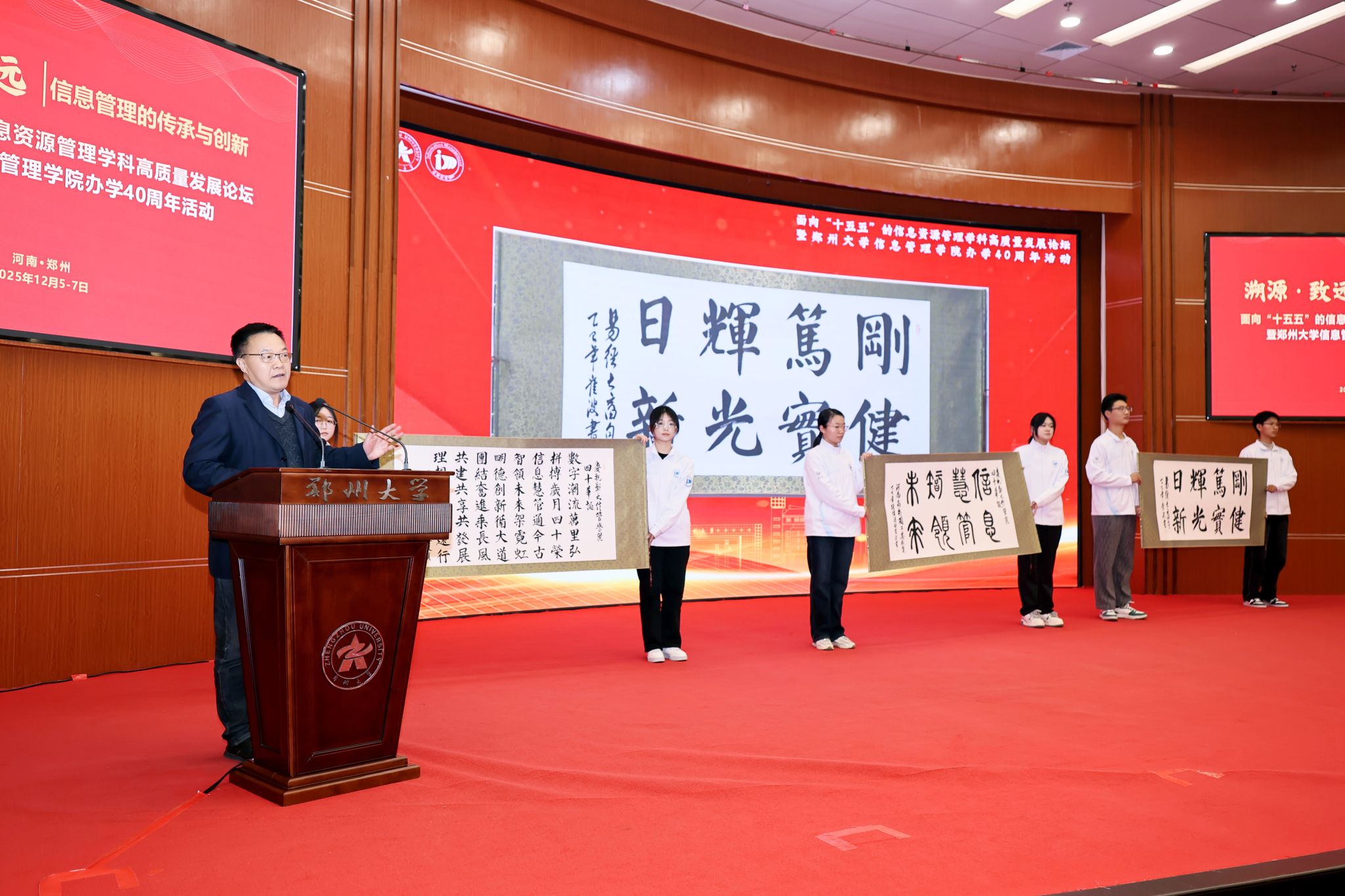 12月6日,“溯源·致远:信息管理的传承与创新——面向‘十五五’的信息资源管理学科高质量发展论坛暨郑州大学信息管理学院办学40周年”活动在主校区举行。武汉大学人文社会科学资深教授马费成,国务院学位委员会信息资源管理学科评议组召集人武汉大学陈传夫、南京大学孙建军,华中师范大学党委书记夏立新;郑州大学党委书记李成伟,校党委常委、纪委书记、监察专员陈曦等出席。来自全国高校信息资源管理学科专家学者、行业代表、校友代表、相关职能部门及各文科兄弟院系负责人、离退休教师和在校师生等400余人参加活动。