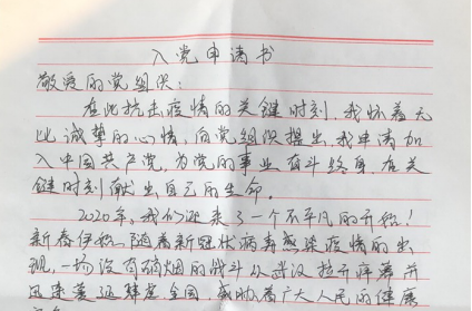 对共产主义的信仰,对身边共产党员的敬仰,在危机时刻下,把许多同志内心那颗早已埋下的种子催生发芽,很多同志将长久的期待化作实际行动,周云龙、杨奇胜同志郑重向党组织递交了入党申请书,纷纷向党组织靠拢,以高标准要求自己。一封封滚烫的入党申请书,就是一份份向疫情宣战的战书!