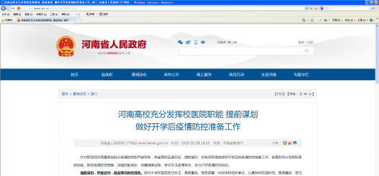 2月8日,河南省人民政府、河南省教育厅官方网站分别发表了题为《河南高校充分发挥校医院职能 提前谋划 做好开学后疫情防控准备工作》《我省高校充分发挥校医院职能 提前谋划 做好开学后疫情防控准备工作》的文章,文中内容充分肯定了校医院在此次新型肺炎疫情防控中所做的工作,“提前谋划,积极应对,制定疫情防控预案。郑州大学校医院密切关注,高度重视,周密部署,协同学校相关单位,认真做好校园防控。高度重视,密切关注疫情发展。校医院于第一时间紧急组织班子成员研究部署医院防控工作,成立郑州大学医院新型冠状病毒感染的肺炎防控工作领导小组和专业小组,提前谋划,积极应对。主动对接,及时掌握最新要求。由校医院领导带队,组织相关人员参加了郑州市卫健委和高新区管委会关于新型冠状病毒感染防控和培训工作系列会议6次,明确新型冠状病毒感染的肺炎处理流程,及时掌握疫情发展态势。”“完善隔离设施,做好开学后防控工作。郑州大学积极应对,全力保障师生健康安全。校医院领导克服种种困难,协调人力物料资源,28小时内紧急完成医院发热门诊改造和完善,于1月25日建成了三区两通道符合要求的发热门诊。”“加强技能培训,明确处置流程。郑州大学1月26日,校医院全体职工结束休假返岗上班,坚守岗位,并开展新型冠状病毒感染的肺炎专题培训。学习了新型冠状病毒感染肺炎的诊疗标准、上报流程、应急处置、防控措施等,强化培训了消毒、隔离、防护等技能。”《消费日报网》也设专栏进行了相关报道。
