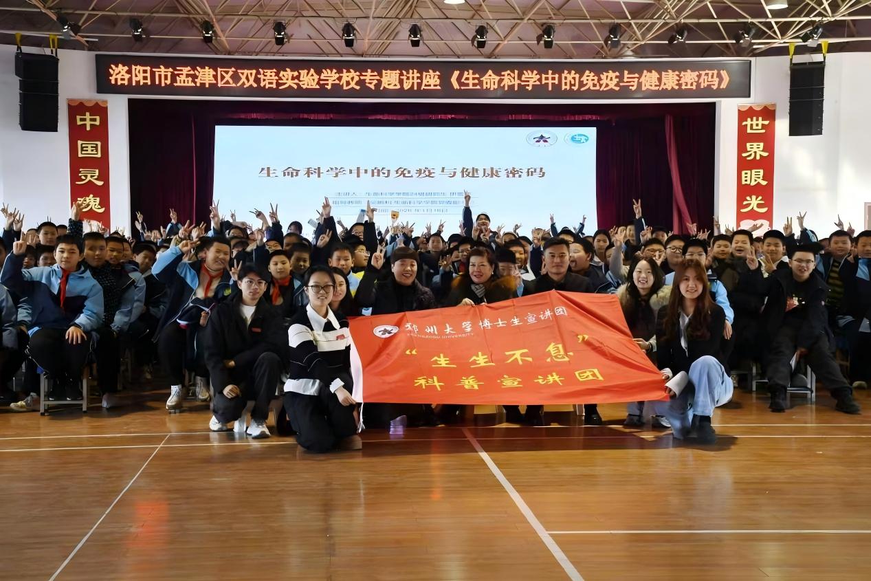 为深入践行高校服务社会职能,推动优质教育资源下沉,2026年1月16日,郑州大学生命科学学院“生生不息”科普宣讲团在学院党委副书记吴艳利的带领下,走进洛阳市孟津区双语实验学校,面向该校400余名学生开展了一场主题鲜明、形式新颖的,以“免疫与生命健康”为主题的科普活动。作为学院“一学科一品牌”建设的重要组成部分,此次大型科普活动是“生生不息”科普宣讲团拓展服务范围、提升社会影响力的重要实践。