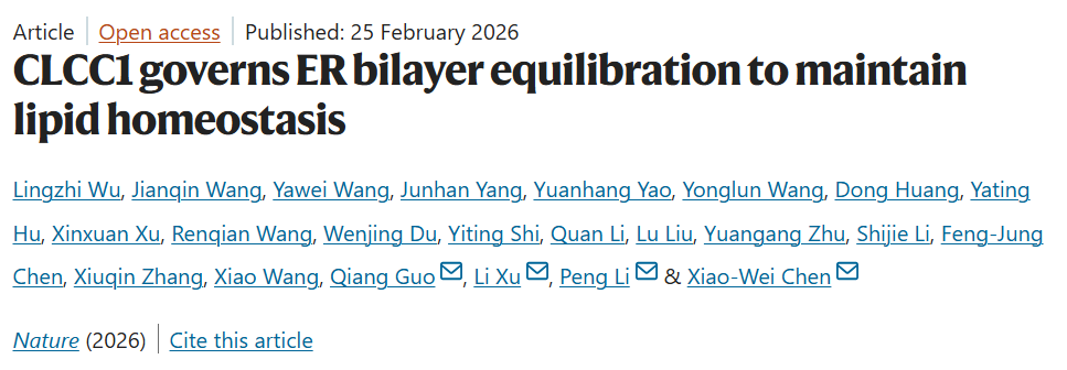 2026年2月25日,郑州大学医学前沿交叉学院、代谢紊乱与食管癌防治全国重点实验室、天健先进生物医学实验室李蓬团队、北京大学陈晓伟团队、北京大学郭强团队,在Nature合作发表了题为CLCC1 Governs ER Bilayer Equilibration to Maintain Lipid Homeostasis的研究论文,鉴定出内质网膜稳态关键感应因子CLCC1,并阐明其调控脂质分配的分子机制。